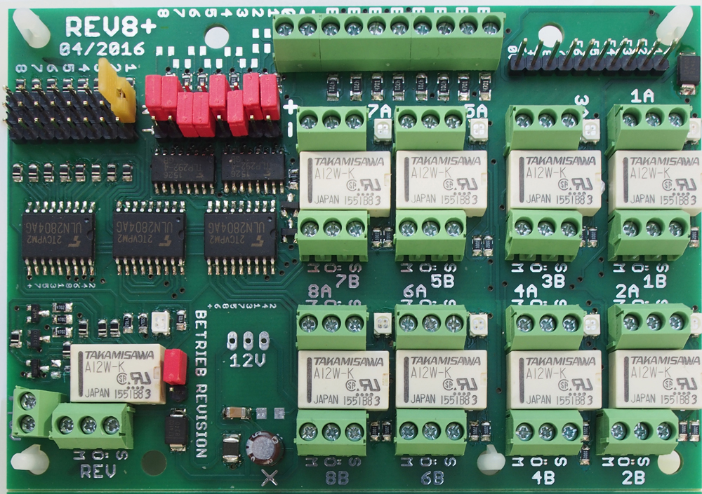 Revisionsplatine mit 8 Eingängen und 8 Relais (je 2x UM) 10,5-14V/DC, Eingangspotentiale umschaltbar „REV8+“