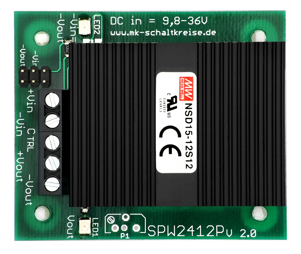 Ein weiterer Vorteil dieser Spannungswandler-Platine besteht darin, dass je nach Typ, bereits ab einer Eingangsspannung von 9,2 V (5W-Variante), 9,8V (10W-Variante) und ab 9,4 Volt (15W-Variante), eine Spannung von 12 Volt erzeugt wird. Das bedeutet, dass das Spannungsspektrum zwischen z.B. 9,8V-36V DC eine stabile Ausgangsspannung von 12 Volt liefert. Dieses kann besonders dann von Vorteil sein, wenn eine Notstromversorgung auf Akkubetrieb umgeschaltet hat und die zu speisenden Komponenten auf eine Betriebsspannung von 12Volt angewiesen sind. Der „Control-Eingang“ ermöglicht eine Abschaltung der Ausgangsspannung durch das Anlegen von 0 Volt.