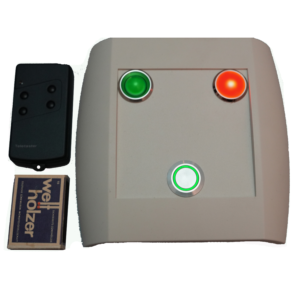 Optional gibt´s, wie oben beschrieben, für den Zufallsgenerator „ZUFALL-GSA-F“ eine 4-Kanal Funkempfänger- Einheit. Mit dem 4- Kanal Funkhandsender lassen sich die 4 „Zufallsraten (10%, 30%, 50% oder 80%) direkt ansteuern und abspeichern. Als Rückmeldung blinkt der Leuchtring des Tasters, entsprechend der angewählten Zufallsrate. Die zuletzt abgespeicherte Zufallsrate wird jedes Mal, wenn die Versorgungsspannung angeschlossen wird, durchs blinken des Leuchtrings angezeigt.