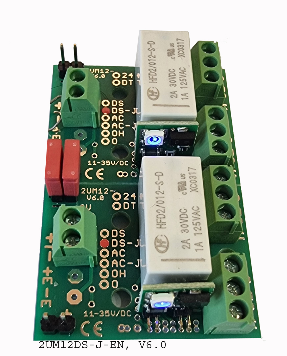Die Spannungsversorgung für diese Relaisplatine erlaubt ein Spannungsspektrum zwischen 11 und 35 Volt (DC). Im Bereich dieser Versorgungsspannung wird die Spule des 12 Volt-Relais ausreichenden mit Spannung versorgt (s. Beschreibung „2UM12DS-EN“).