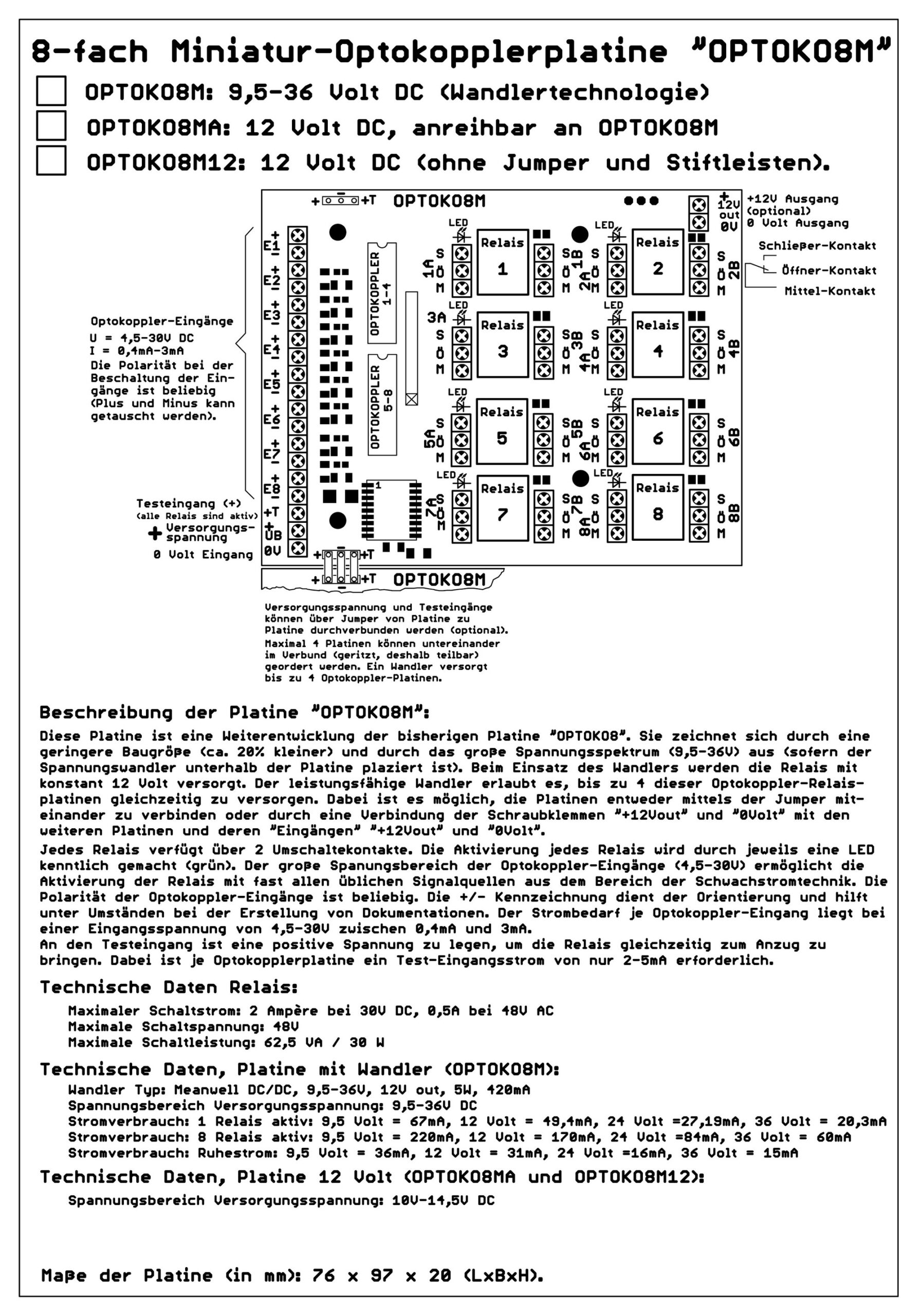 Betriebsspannung: 9,5-36 Volt /DC, Schaltstrom: 2 Ampère, jedem Relais sind zwei Umschaltkontakte zugeordnet, je eine grüne LED signalisiert: „Relais aktiv“, die Platinen sind anreihbar, die Relais werden – sofern die Versorgungsspannung angelegt ist – durch das Anlegen einer Spannung an den Optokoppler-Eingängen (4,5-30V/DC, I = 0,4-3mA) zum Anzug gebracht, ein „Plus-Signal“ am Test-Eingang „+T“ lässt sämtliche Relais (auch wenn mehrere Platinen untereinander durchverbunden sind) zum Anzug bringen, über die vorhandenen Stiftleisten (oben und unten) lässt sich diese Platine „OPTOKO8M“ mit den anreihbaren Platinen „OPTOKO8MA“ kombinieren, es können bis zu 3 Platinen der Sorte „OPTOKO8MA“ von der „OPTOKO8M“ versorgt werden, eine 2polige Anschlussklemme bekommt vom Wandler eine konstante Spannung von 12 Volt /DC, der Entnahmestrom an dieser Klemme liegt bei 300mA und er reduziert sich je angeschlossener Platine „OPTOKO8M12“ um jeweils 100mA, zur raschen Montage der Platine liegen jeder Verpackungseinheit 4große selbstklebende Befestigungssockel bei, der beigefügte „Beipackzettel“ beschreibt in Kurzform das Produkt incl. der Beschaltung der Platine und enthält die Auflistung der technischen Daten.