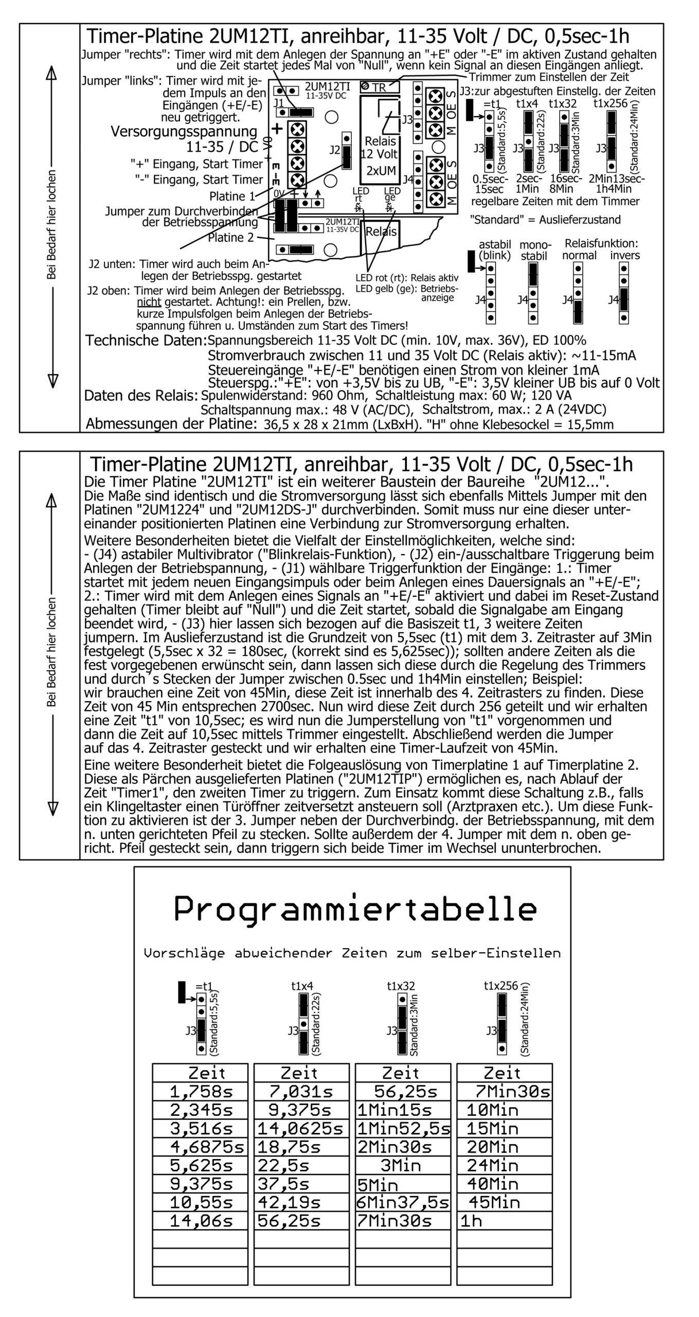 Miniatur-Timerplatine 2UM12TI mit div. Programmiermöglichkeiten, wie: Blinkrelais-Funktion; Triggern beim Anlegen der Versorgungsspannung (ein- ausschaltbar); „re-triggern“ bei jedem erneuten Impuls an den Steuereingängen „+E“ und „-E“ während der Timer „läuft“ (ein- und ausschaltbar), kombinierbar m. 2UM1224 u. 2UM12DS-J, der beigefügte „Beipackzettel“ beschreibt in Kurzform das Produkt incl. der Beschaltung der Platine und enthält die Auflistung der technischen Daten.